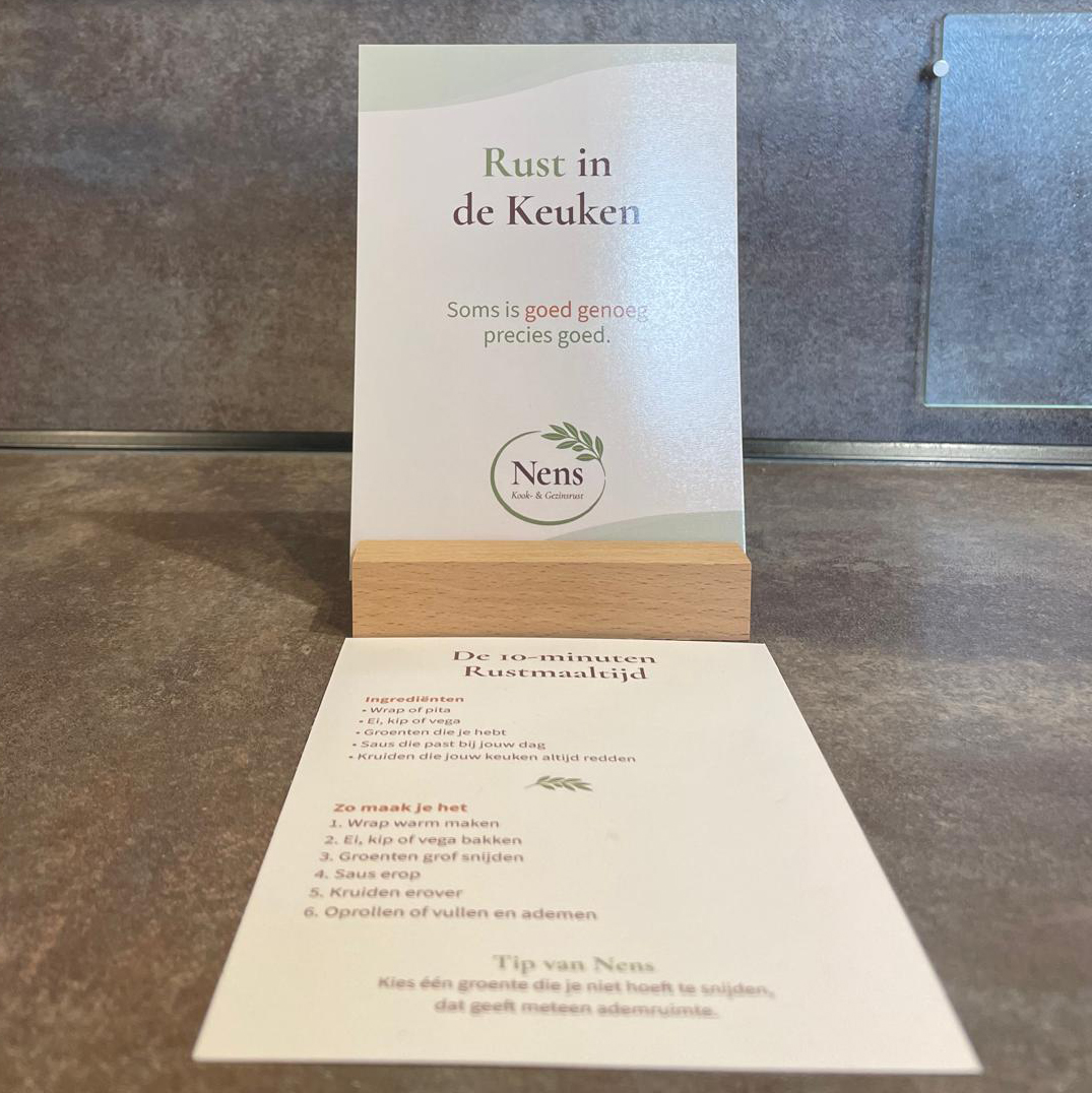 Deze set brengt overzicht in je keuken. Eén recept dat past bij jouw dag en een houten houder die het mooi laat staan. Geen zoeken, geen bladeren. Gewoon neerzetten, kijken, koken.